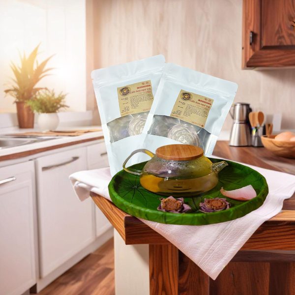 Trà Hoa Sen Đồng Tháp Nguyên Bông Hoa sen sau khi hái về sẽ được phân loại và chọn ra những bông tươi đạt tiêu chuẩn. Người làm trà cần phải xử lý qua nhiều công đoạn để loại bỏ hoàn toàn bụi bẩn và tạp chất. Bông sen sẽ được sấy bằng một công nghệ đặc biệt để không làm mất đi màu sắc, lượng tinh dầu và mùi hương mà vẫn giữ nguyên vẹn hình dáng ban đầu của hoa. Trà hoa sen sau khi pha có hương thơm thoang thoảng, vị thanh nhẹ nhàng. Khi dùng có thể thêm vào đường phèn hoặc mật ong để làm tăng hương vị thơm ngon cho sản phẩm. Ngày nay, trà sen nguyên bông đã trở thành một loại trà uống yêu thích của rất nhiều người. Cũng như được sử dụng để làm quà gửi tặng với hàm ý gửi đi sự bình yên, thư thái và thoai mái trong tâm hồn. CÔNG DỤNG: